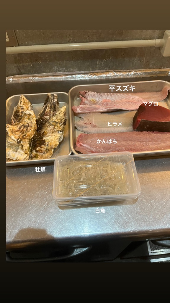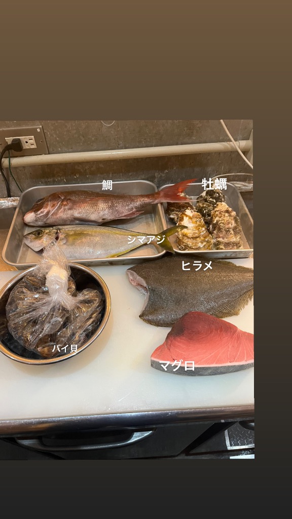 宮城県産 生本マグロ、香川県産 天然鯛、岩手県産 牡蠣、シマアジ、ヒラメ、バイ貝