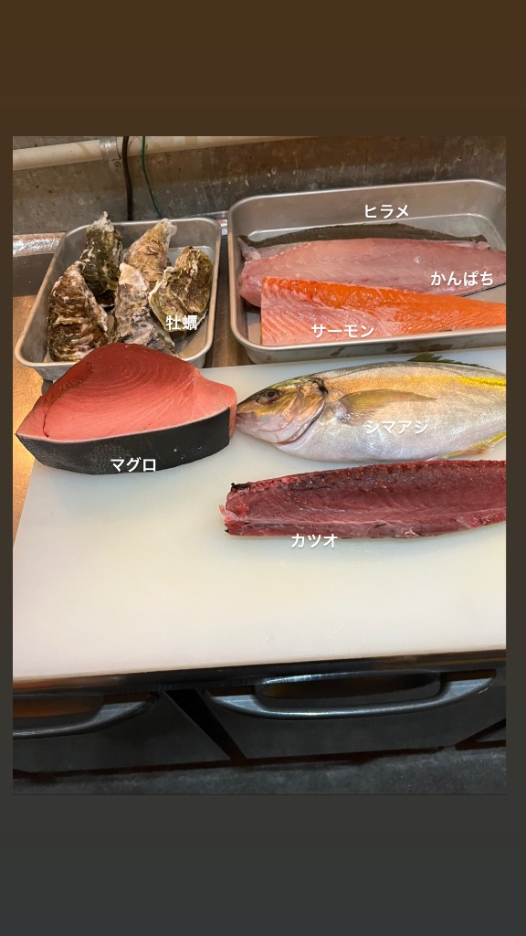 宮城県産 生本マグロ、岩手県産 牡蠣、ヒラメ、かんぱち、サーモン、ヤイトガツオ