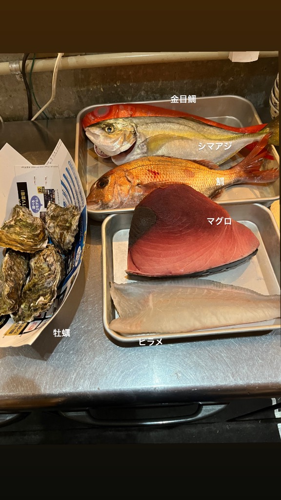宮城県産 生本マグロ、兵庫県産 天然鯛、千葉県産 金目鯛広島県産 牡蠣、ヒラメ、シマアジ