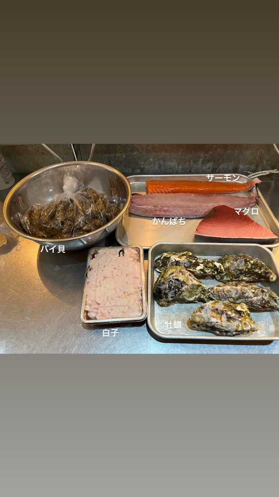宮城県産 生本マグロ、広島県産 牡蠣、かんぱち、サーモン、白子、バイ貝
