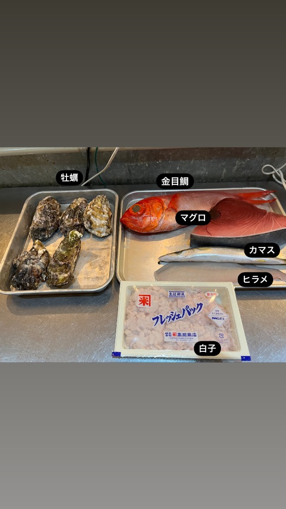 新潟県産 生本マグロ、千葉県産 金目鯛、広島県産 牡蠣、北海道産 白子、カマス、ヒラメ