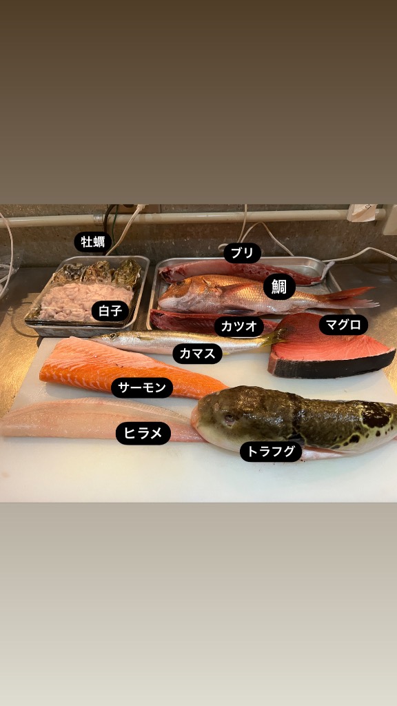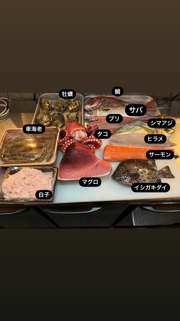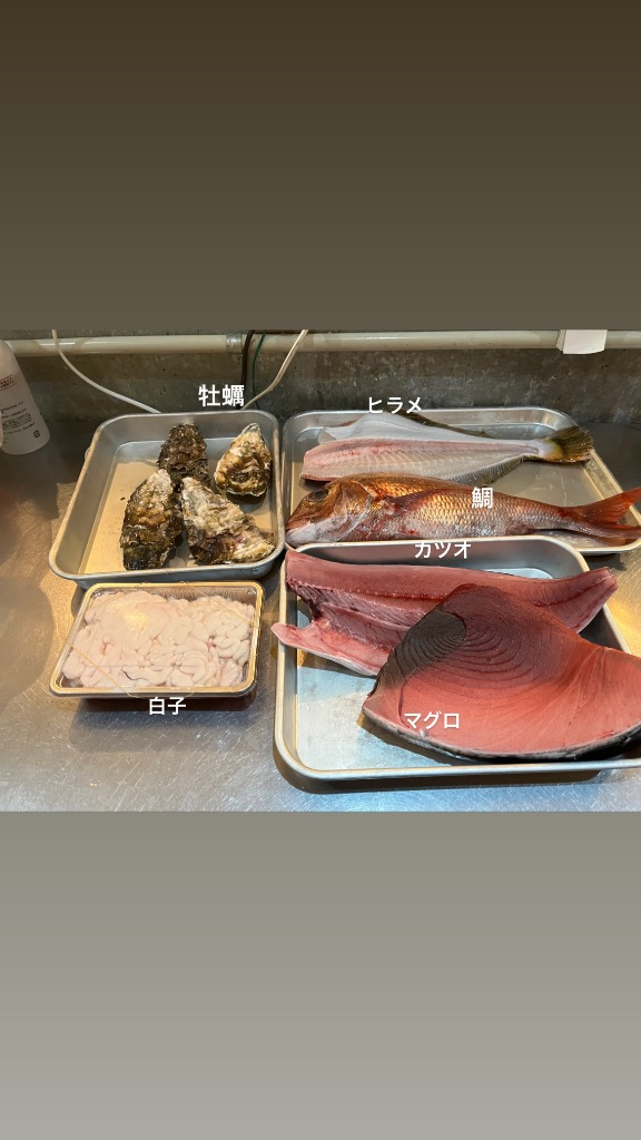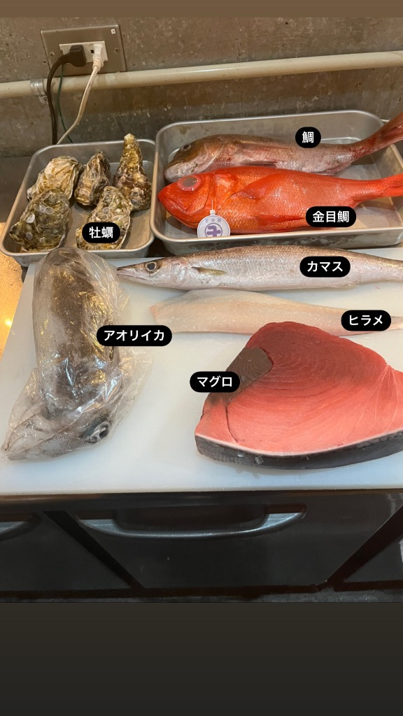 新潟県産 生本マグロ、長崎県産 ヤイトガツオ、兵庫県産 天然鯛、岩手県産 牡蠣、北海道産 白子、ブリ、ヒラメ、サーモン、カマス、トラフグ