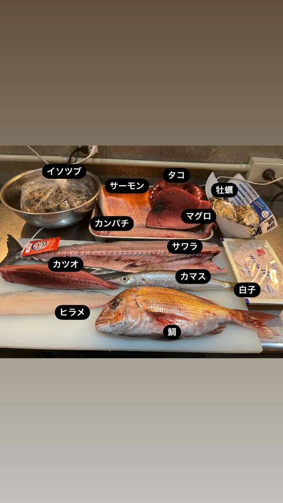 新潟県産 生本マグロ、長崎県産 焼津カツオ、長崎県産 カマス、兵庫県産 天然鯛、岩手県産 牡蠣、北海道産 白子、サーモン、タコ、ヒラメ、カンパチ、イソツブ
