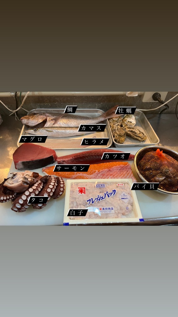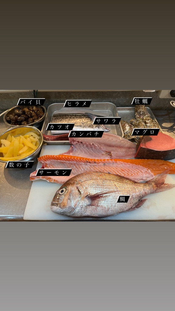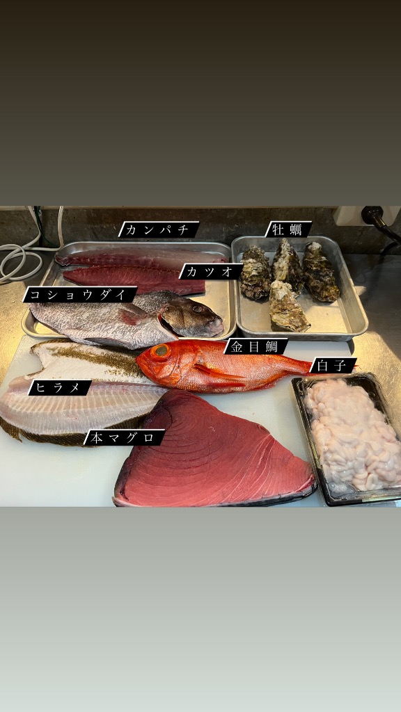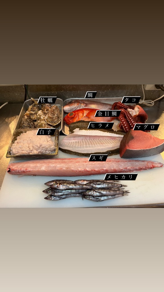 高知県産 生マグロ、岩手県産 牡蠣、北海道産 白子、兵庫県産 天然鯛、福岡県産 目光、千葉県産 金目鯛、スギ、ヒラメ、タコ