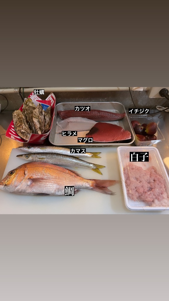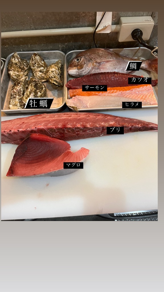 北海道産 生本マグロ、宮城県産 牡蠣、宮城県産 カツオ兵庫県産 鯛、カマス、ヒラメ、イチジク、白子