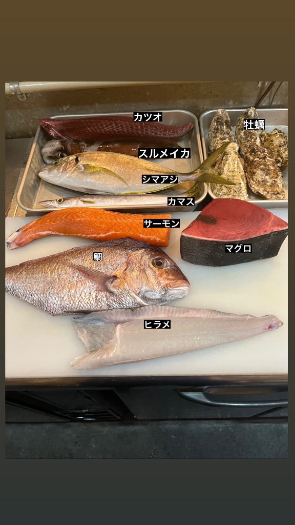 北海道産 生本マグロ、長崎県産 シマアジ、鹿児島県産 カツオ、兵庫県産 鯛、宮城県産 牡蠣、ヒラメ、カマス、サーモン、スルメイカ