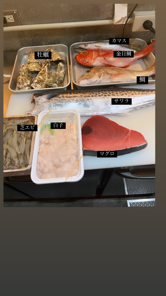北海道産 生本マグロ、兵庫県産 鯛、東京都産 金目鯛、宮城県産 牡蠣、北海道産 白子、白子ポン酢、サワラ、カマス