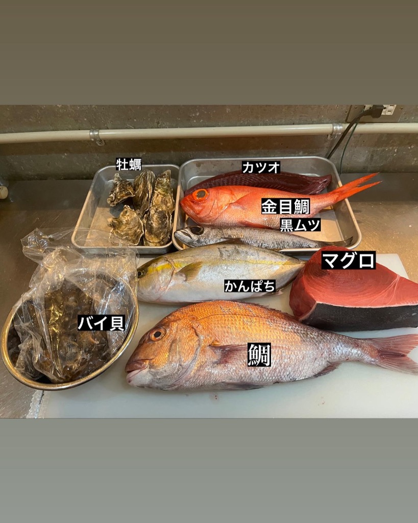 北海道産 生本マグロ、香川県産 鯛、徳島県産 かんぱち、鹿児島県産 カツオ、宮城県産 牡蠣、東京都産 金目鯛黒ムツ、バイ貝