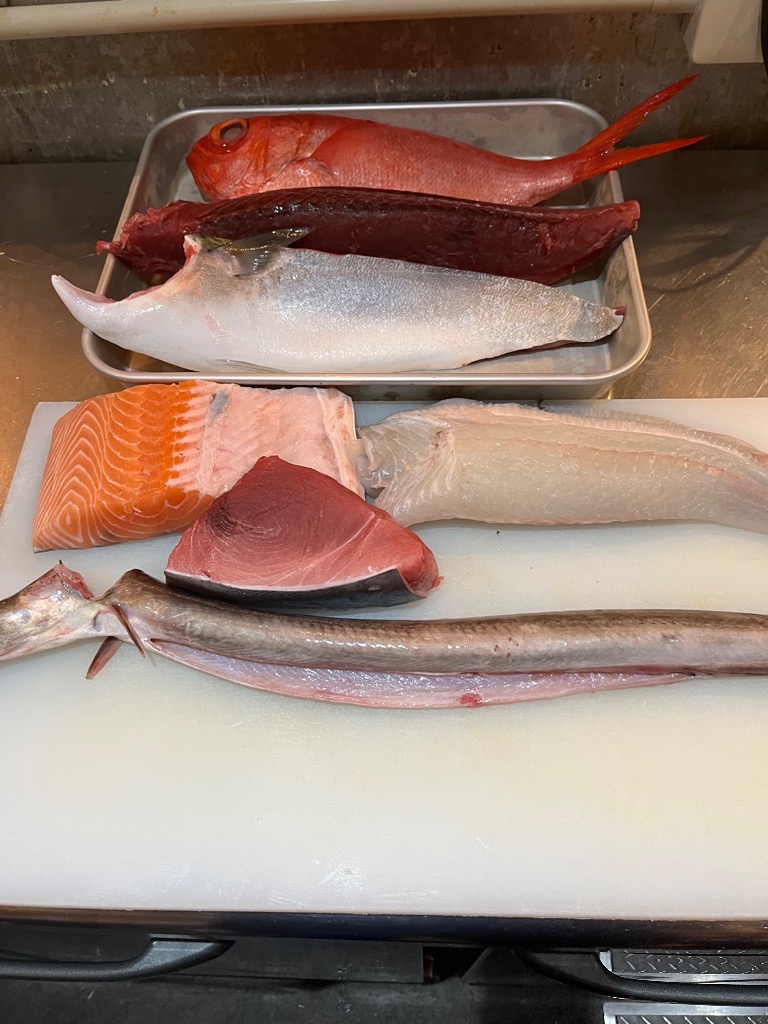 宮城県産 メバチマグロ、宮城県産 カツオ、ハモ、ヒラメ、ハマチ、サーモン、金目鯛