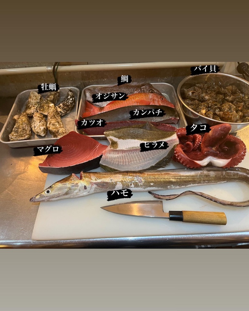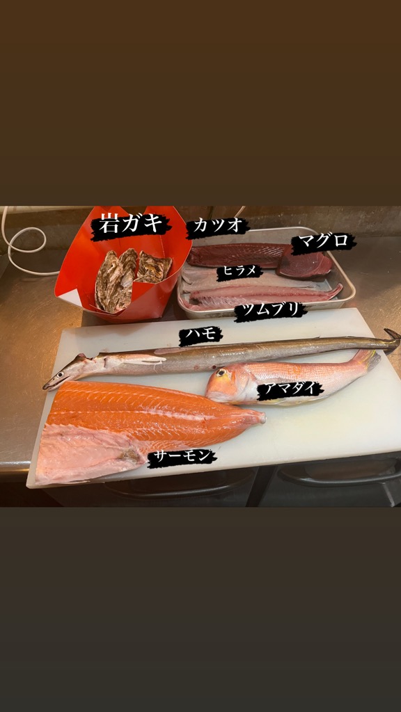 新潟県産 生本マグロ、北海道産 牡蠣、ハモ、カツオ、ヒラメ、カンパチ、タコ、バイ貝、オジサン、鯛