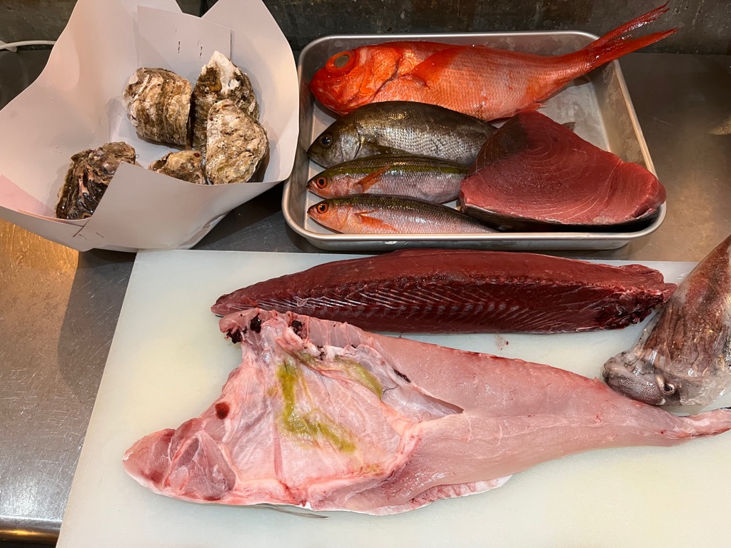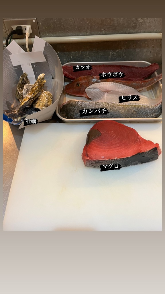 生本マグロ、宮城県産 カツオ、徳島県産 イサキ、鳥取県産 岩ガキ、静岡県産 金目鯛、グルクン、イトヒキアジ、剣先イカ