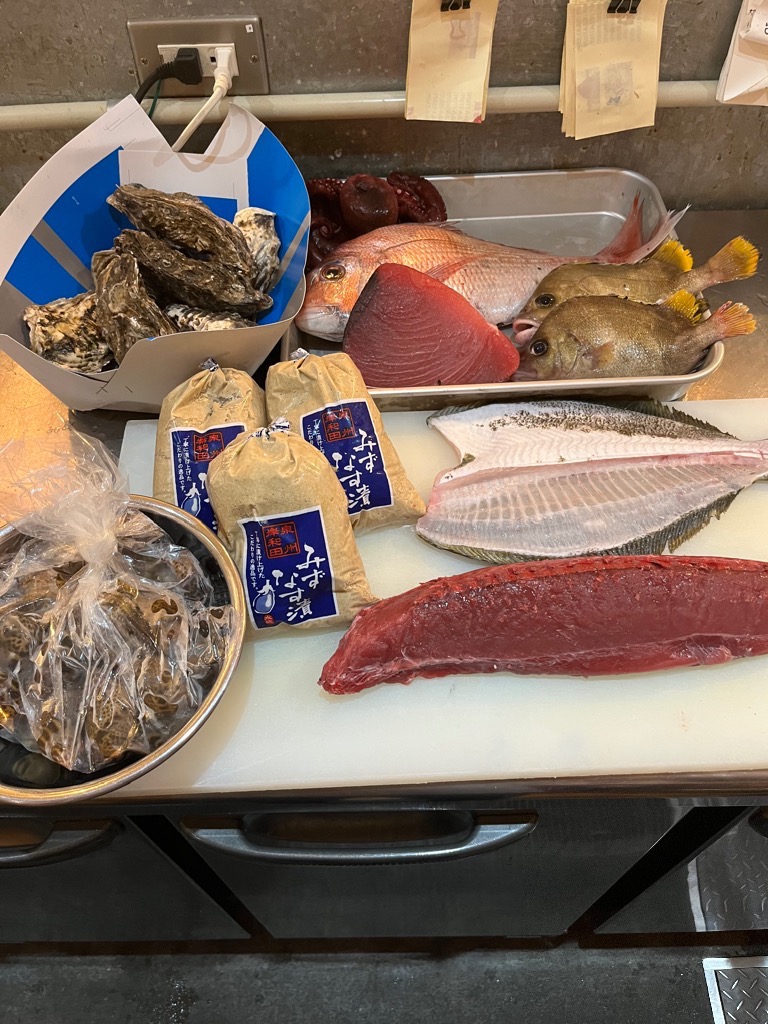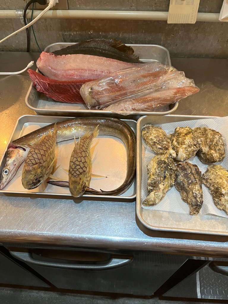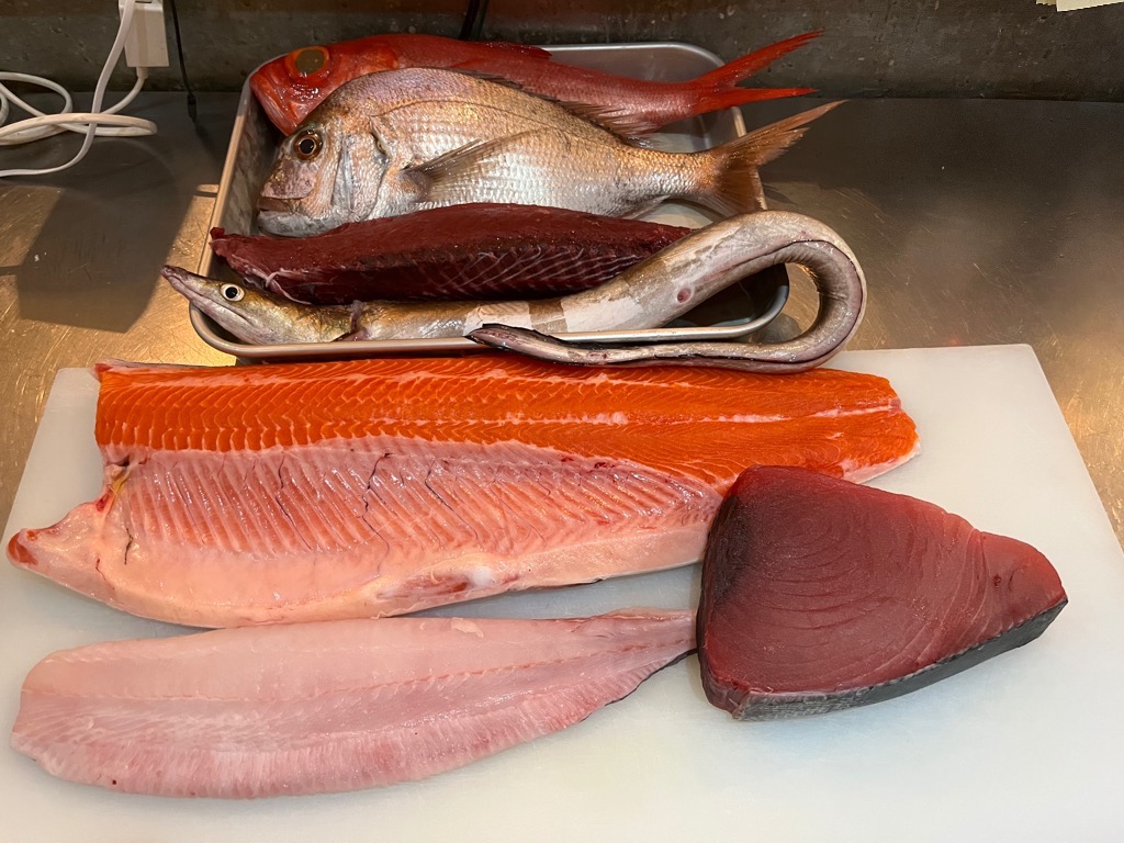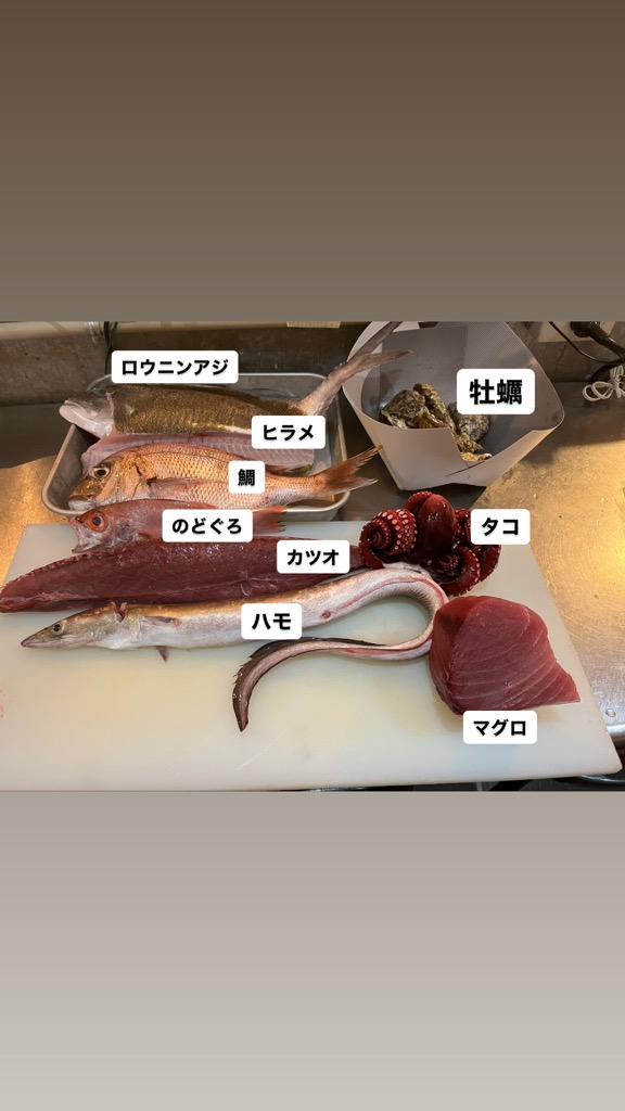 宮崎県産 生キハダマグロ、宮城県産 カツオ、北海道産 牡蠣、兵庫県産 鯛、愛媛県産 ハモ、ヒラメ、ロウニンアジ、のどぐろ、タコ