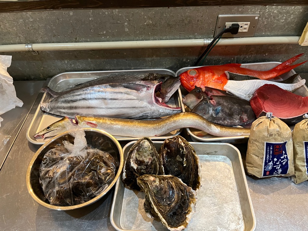 宮城県産 生本マグロ、宮城県産 カツオ、千葉県産 金目鯛、熊本県産 岩ガキヒラメ、ロウニンアジ、ヒラメ、ハモ、カワハギ、バイ貝、泉州水ナス