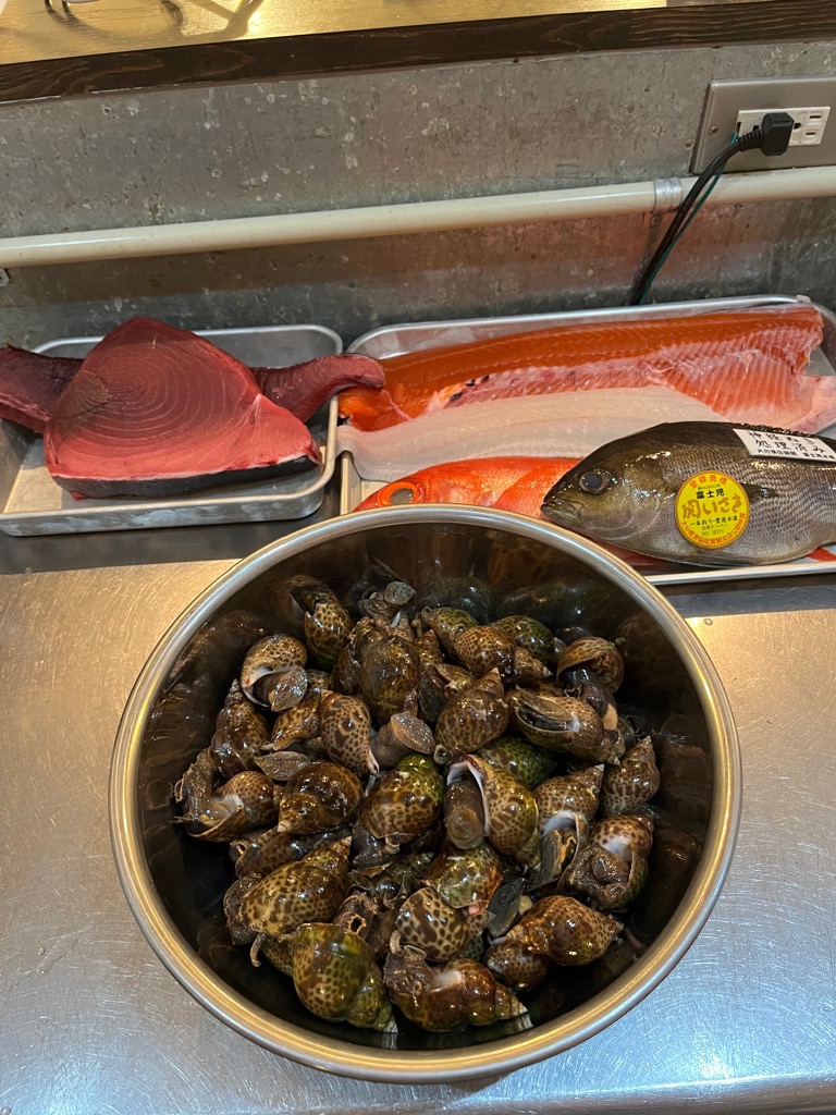 鳥取県産 生本マグロ、千葉県産 金目鯛、千葉県 カツオ、大分県産 イサキ、ヒラメ、サーモン、バイ貝