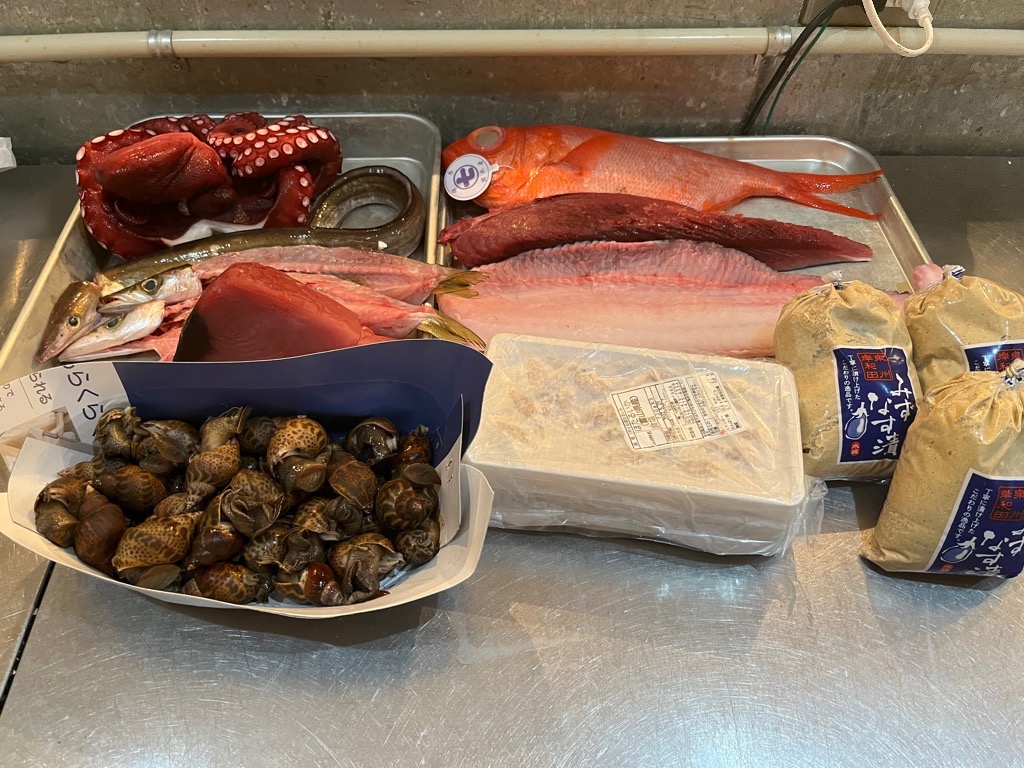 キハダマグロ 高知県、カツオ 三重県、ホタルイカ 富山県、金目鯛 千葉県、ハモ 兵庫県、タコ、松皮カレイ、バイ貝、カマス