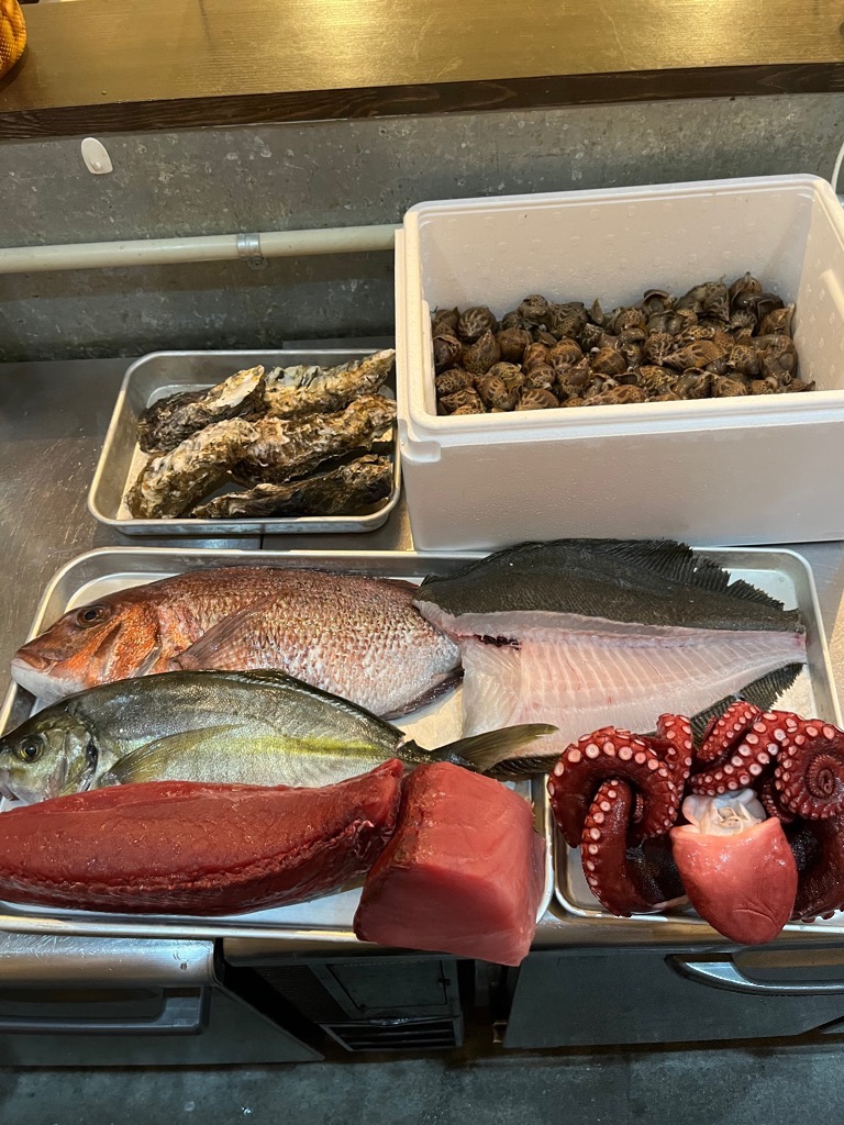 静岡県産 キハダマグロ、静岡県産 カツオ、宮城県産 生ガキ、ヒラメ、タコ、鯛、シマアジ、バイ貝