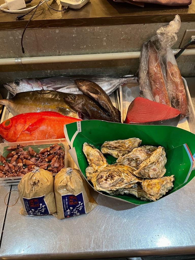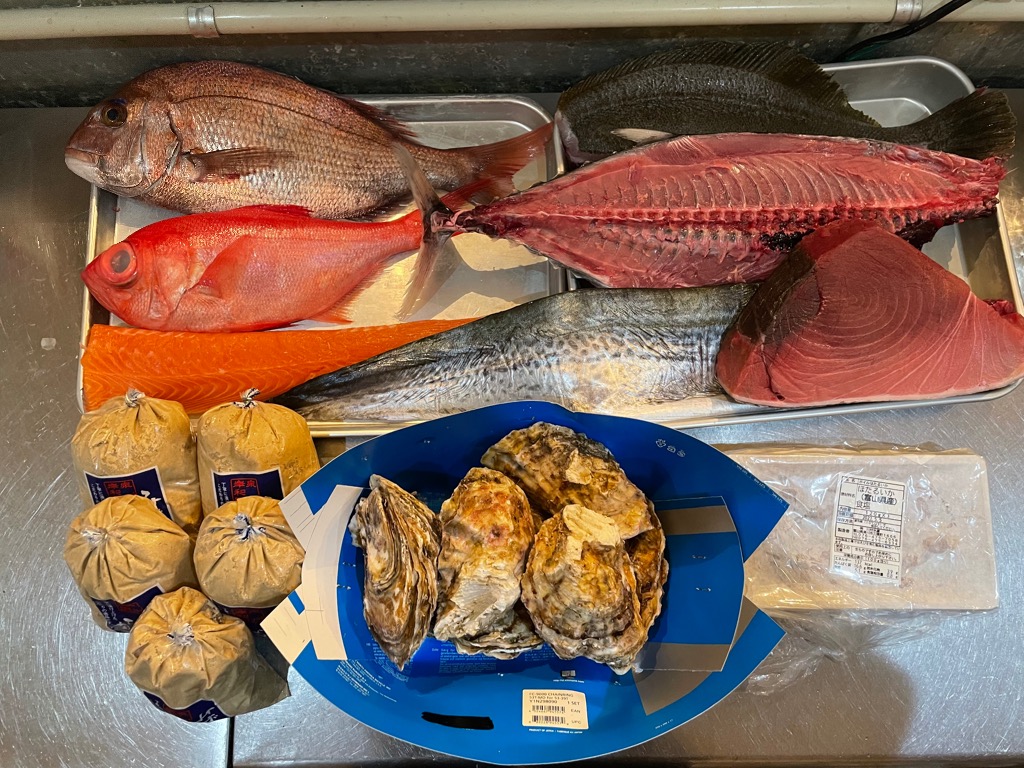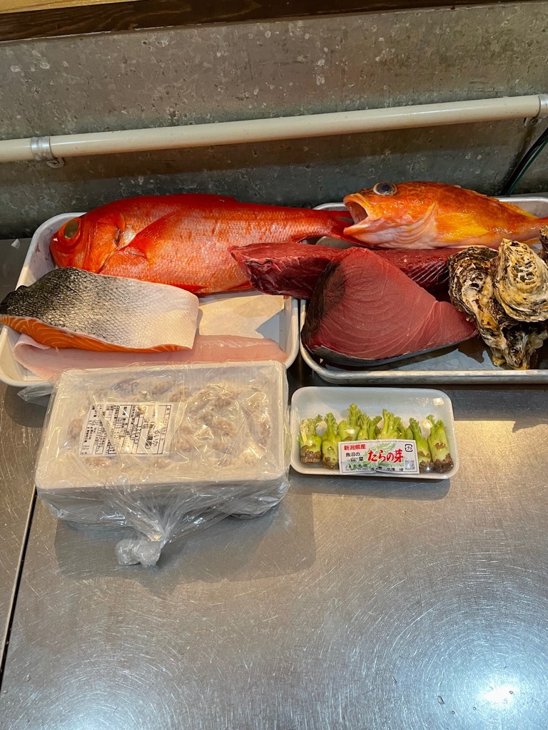 沖縄県産 キハダマグロ、静岡県産 カツオ、千葉県産 金目鯛、岩手県産 雪解け牡蠣、兵庫県産 ホタルイカ、かんぱち、メバル、剣先イカ