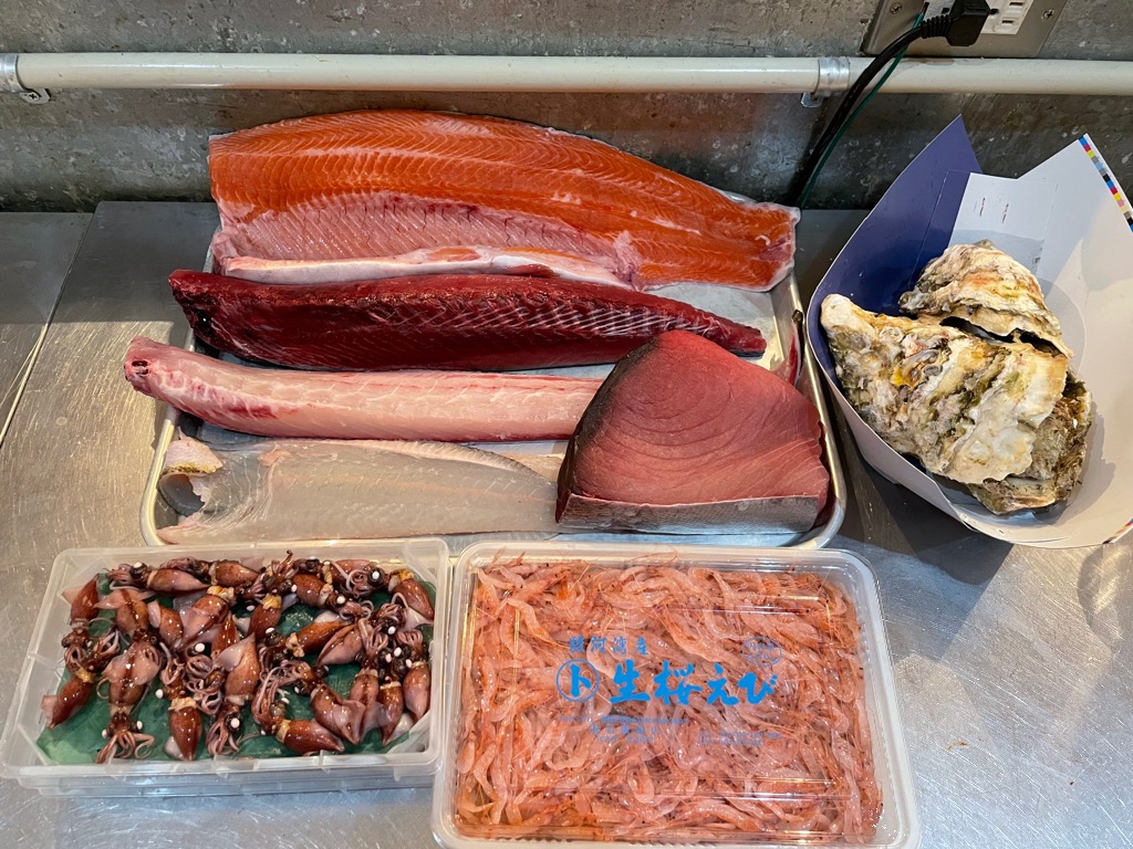 沖縄県産 キハダマグロ、三重県産 カツオ、隠岐島産 岩ガキ、兵庫県産 ホタルイカ、ヒラメ、スギ、アルプスサーモン、桜海老