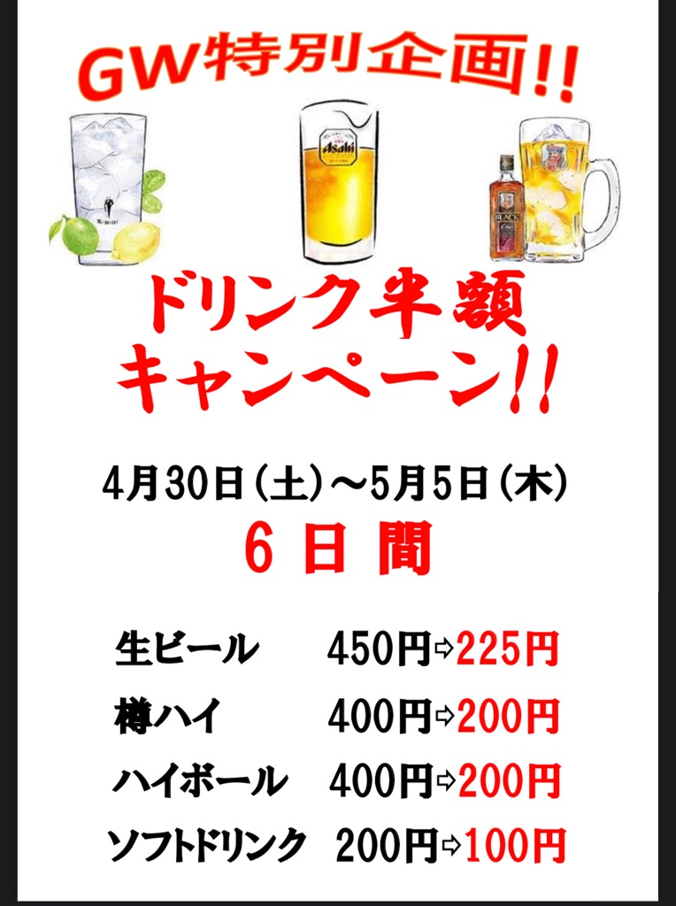 GW限定‼︎ドリンク半額キャンペーン‼︎