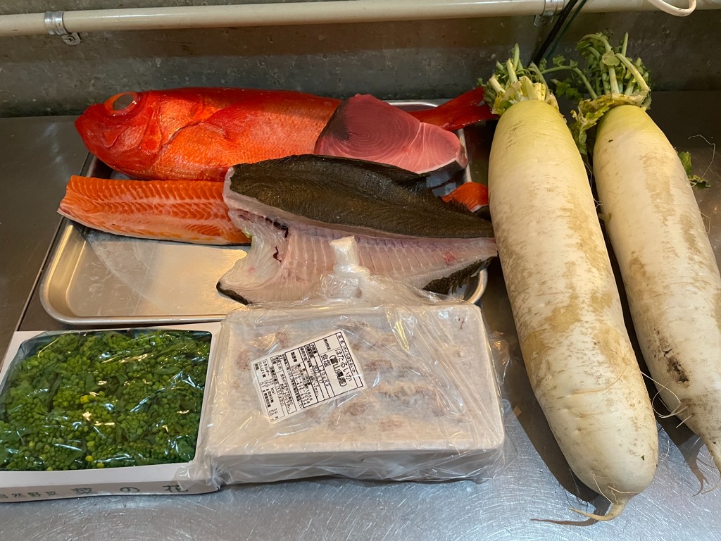 宮城県産 本マグロ、静岡県産 金目鯛、ヒラメ、サーモン、富山県産 ホタルイカ、菜の花