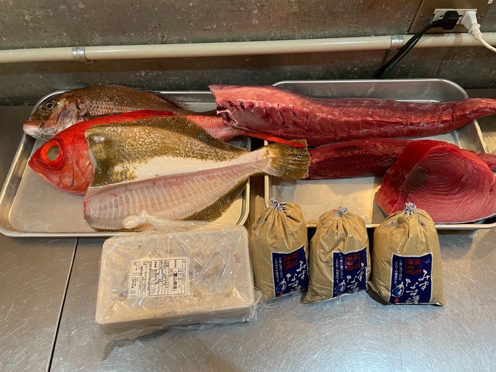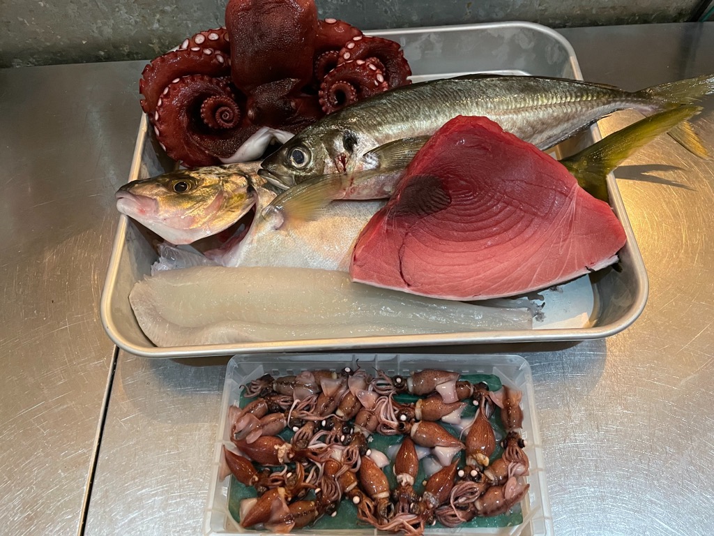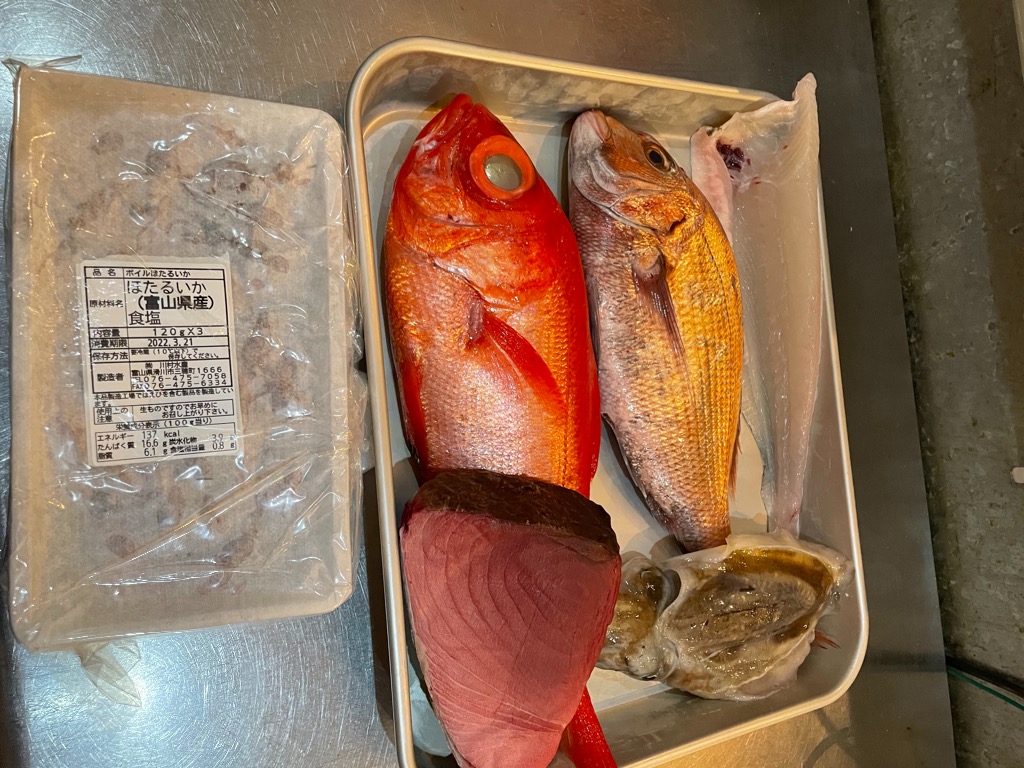 佐賀県産 生本マグロ、徳島県産 鯛、静岡県産 金目鯛、富山県産 ホタルイカ、ヒラメ、ハリイカ
