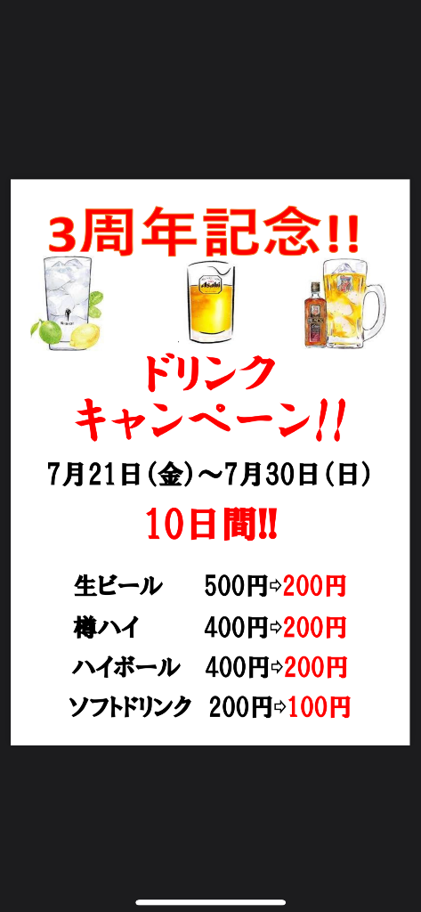 生ビール、酎ハイ、ハイボール200円でご提供いたします!